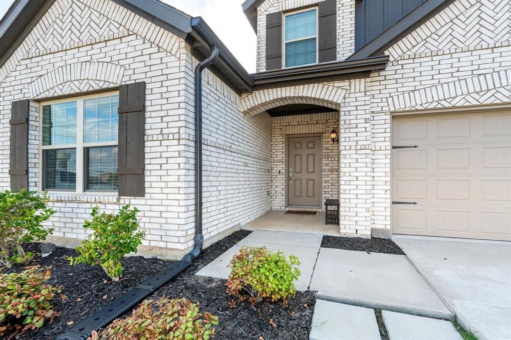 Beautiful white brick home with cedar accents, elevated ceilings, & abundant natural light, backing to open space with peaceful sunset views. Wood grain tile floors run throughout all first floor common areas, creating a clean, cohesive feel. The open layout connects the kitchen, dining, & living spaces, making it easy to live & entertain. The kitchen features white cabinets, granite countertops, gas range, stainless steel appliances, corner walk in pantry, & a textured herringbone backsplash that adds depth & style. Dining area includes a built in window seat, & the living room offers a bright, open feel buyers are looking for. First floor includes a private study with French doors, a guest bedroom & full bath, plus a spacious utility room with room for an extra fridge. The primary suite features a bay window, elevated ceiling, large walk in closet, & a well designed bath with dual sinks, frameless glass shower, & space for a dressing area. Upstairs offers a loft style game room & 2 additional bedrooms, along with a full bath with dual sinks & quartz countertops. Enjoy a large covered patio, wood privacy fence, no rear neighbors, & beautiful sunset views. Tankless water heater, sprinkler system, & exceptional storage throughout make this home as functional as it is inviting.