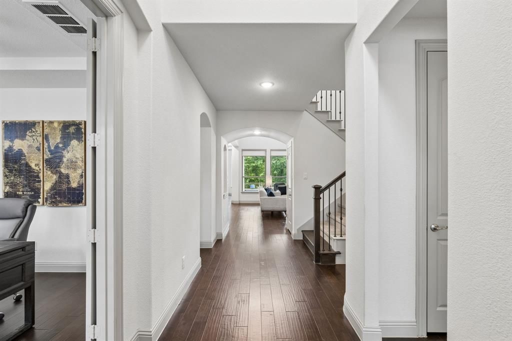 Nestled on an OVERSIZED GREENBELT LOT, this stunning 2-story home offers the perfect blend of privacy, functionality, and stylish living—inside and out. The backyard is truly a retreat, featuring a SPARKLING CHLORINE POOL AND SPA, elegant travertine decking, and a custom-covered arbor designed for year-round enjoyment. From the moment you arrive, the home impresses with its beautiful stone exterior, cedar garage doors, and charming stone planter ledges. Step inside to find engineered hardwood floors flowing throughout the main living areas, complemented by granite countertops and a thoughtfully designed layout. A private office with hardwood flooring sits at the front of the home, along with plantation shutters that add both elegance and natural light control. The DRAMATIC 2-STORY FAMILY ROOM, anchored by a gas fireplace, serves as the heart of the home—perfect for gathering and entertaining. A SECONDARY BEDROOM SUITE ON THE MAIN LEVEL offers flexibility for guests or multigenerational living. Upstairs, enjoy a dedicated media room wired for surround sound and a spacious game room complete with a built-in desk. The primary suite provides a comfortable retreat with plush carpet, dual vanities, a relaxing garden tub, and a custom closet organizer system. The open-concept design is an expansive and versatile living space. and a laundry room with built-in cabinets add everyday convenience. Rounding out the home is a spacious 2.5-car garage with durable epoxy flooring, ideal for storage or hobbies. Recent updates, including a 2024 roof and gutters and a tankless water heater, provide peace of mind and modern efficiency. Lantana residents enjoy access to top-rated schools, scenic walking trails, resort-style pools, pickleball courts, and premier amenity centers.With its premium lot, thoughtful upgrades, and exceptional indoor-outdoor living, 9121 Pecan Woods Trail is a gorgeous home that delivers both comfort and sophistication in a highly desirable setting.